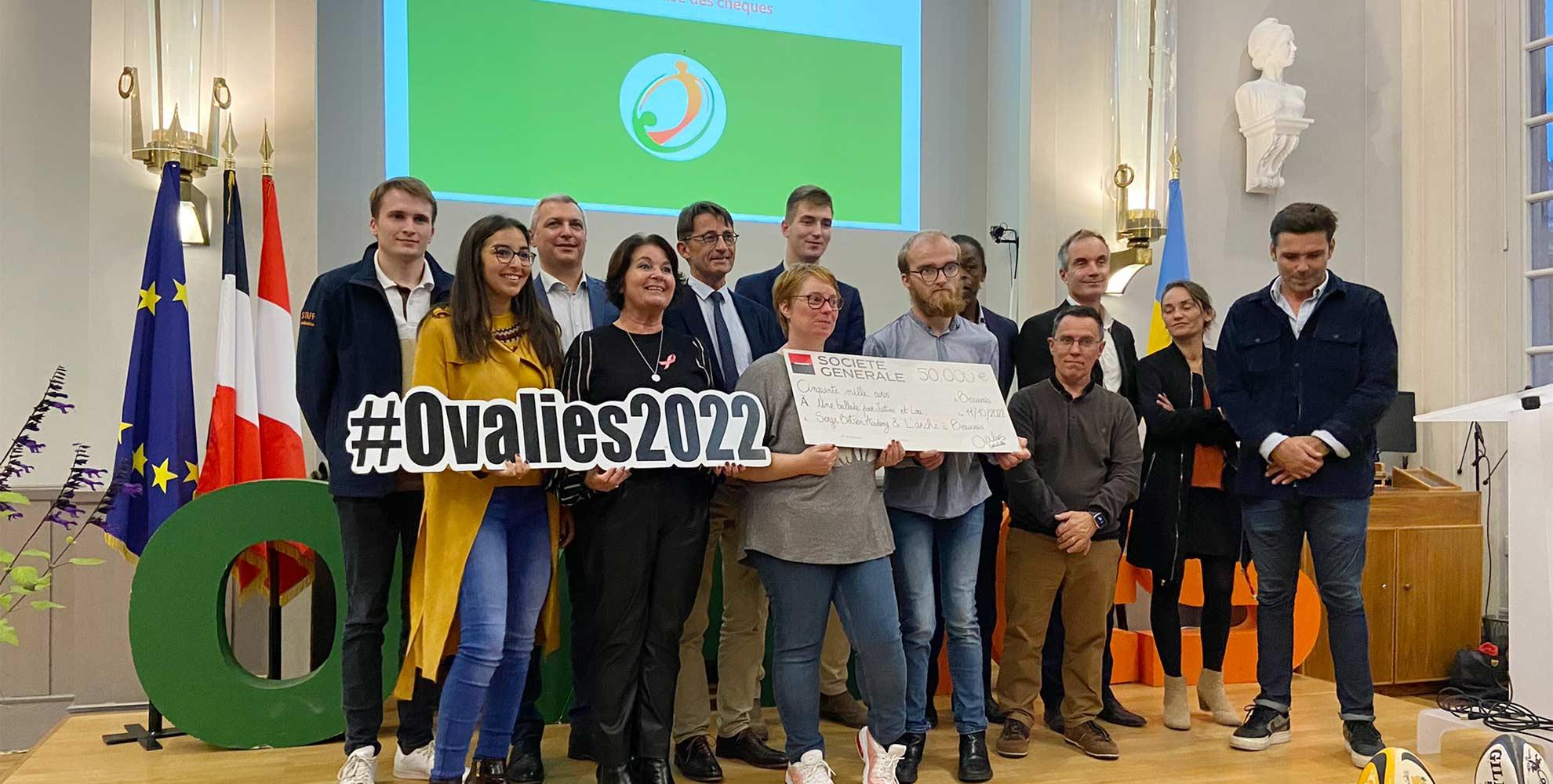 La remise de chèque a eu lieu ce mardi 10 octobre 2022 dans la salle des mariages de l’Hôtel de ville de Beauvais en présence de Franck Pia, maire de Beauvais, Dimitri Yachvili, parrain des 27es Ovalies UniLaSalle, Serge Betsen, ancien international du XV de France, des représentants de la communauté de l’Arche et de nombreux partenaires.